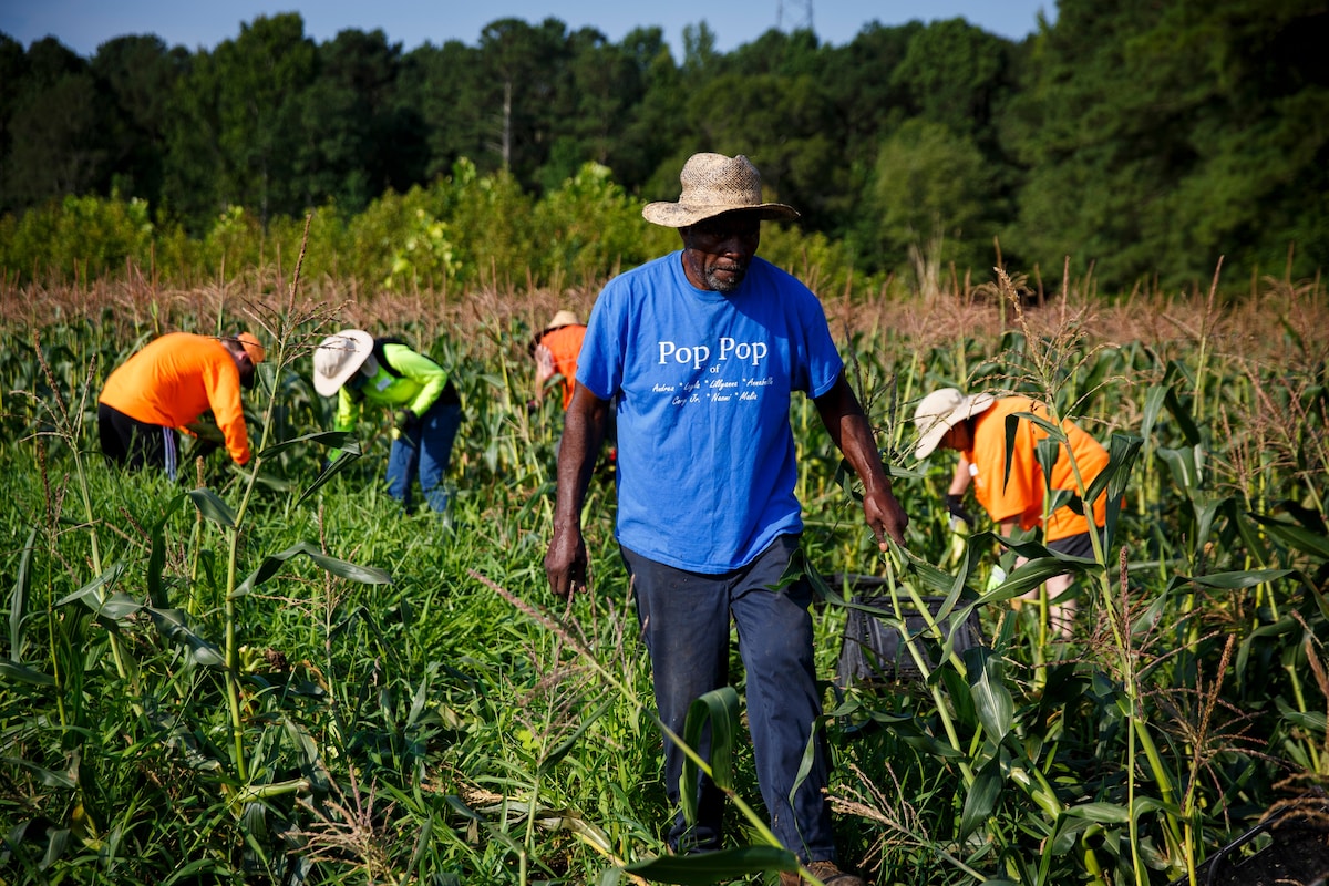 Elisha Barnes leaned over the steering wheel of his blue 1961 Ford tractor as workers from the local food bank trudged through a muddy field and dumped baskets of sweet corn into the bucket. “The rain and the heat is pushing this corn real hard,” he said.
